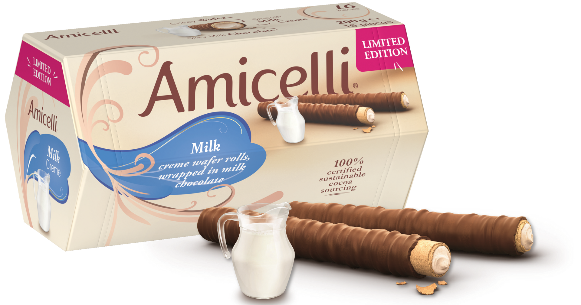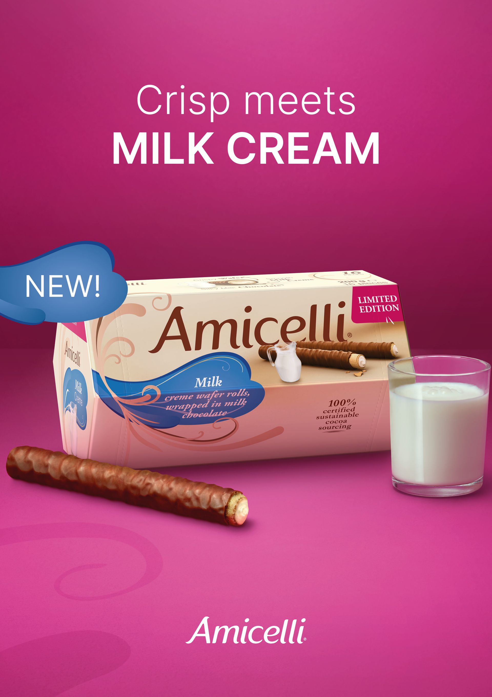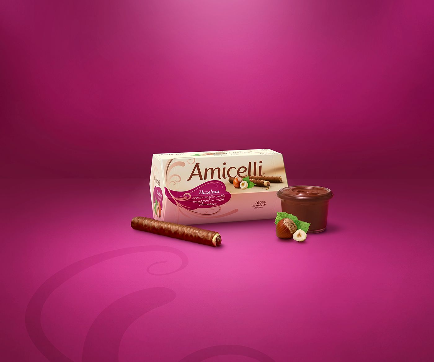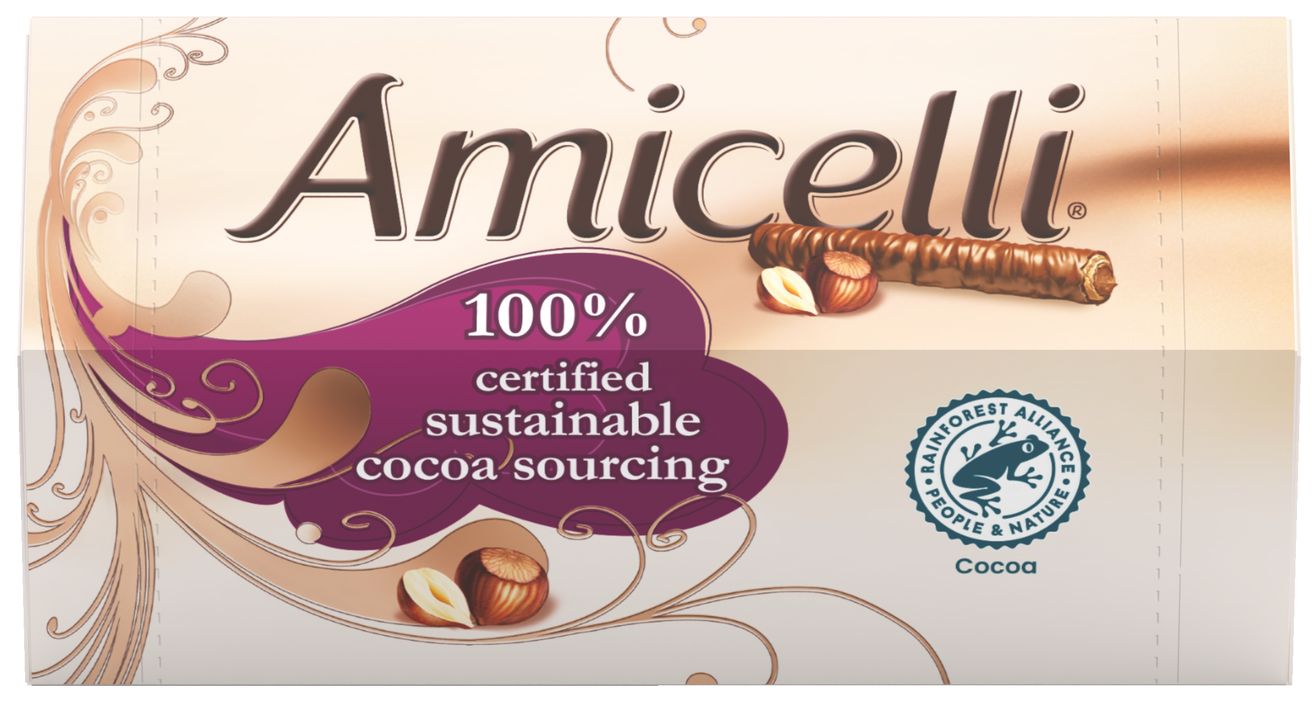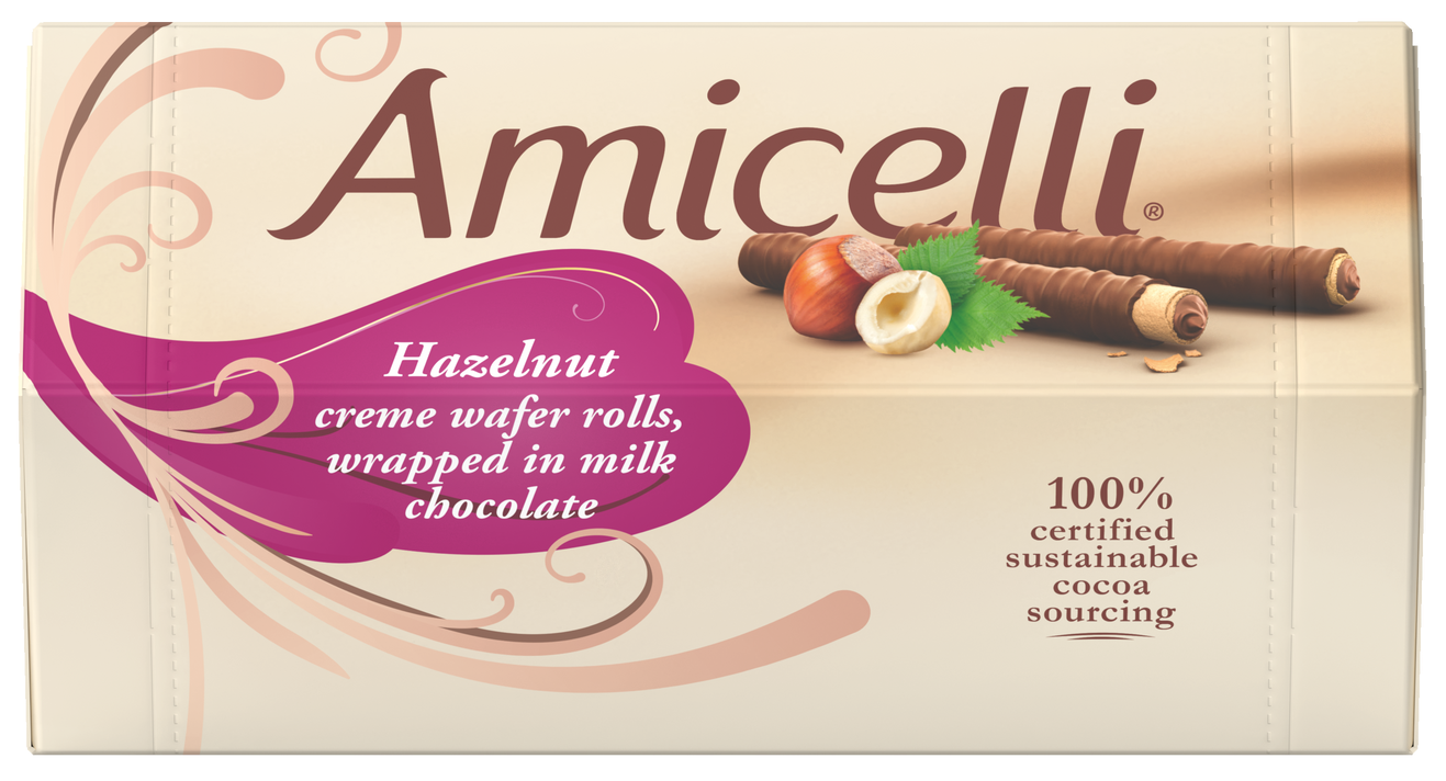 The Amicelli wafer roll is a harmonious combination of a crispy wafer (24%) filled with a tender cream (hazelnut, cocoa or milk – 45%),