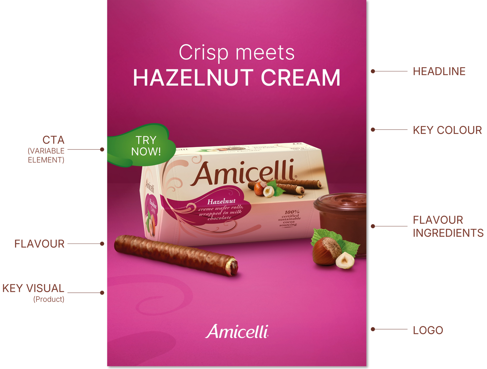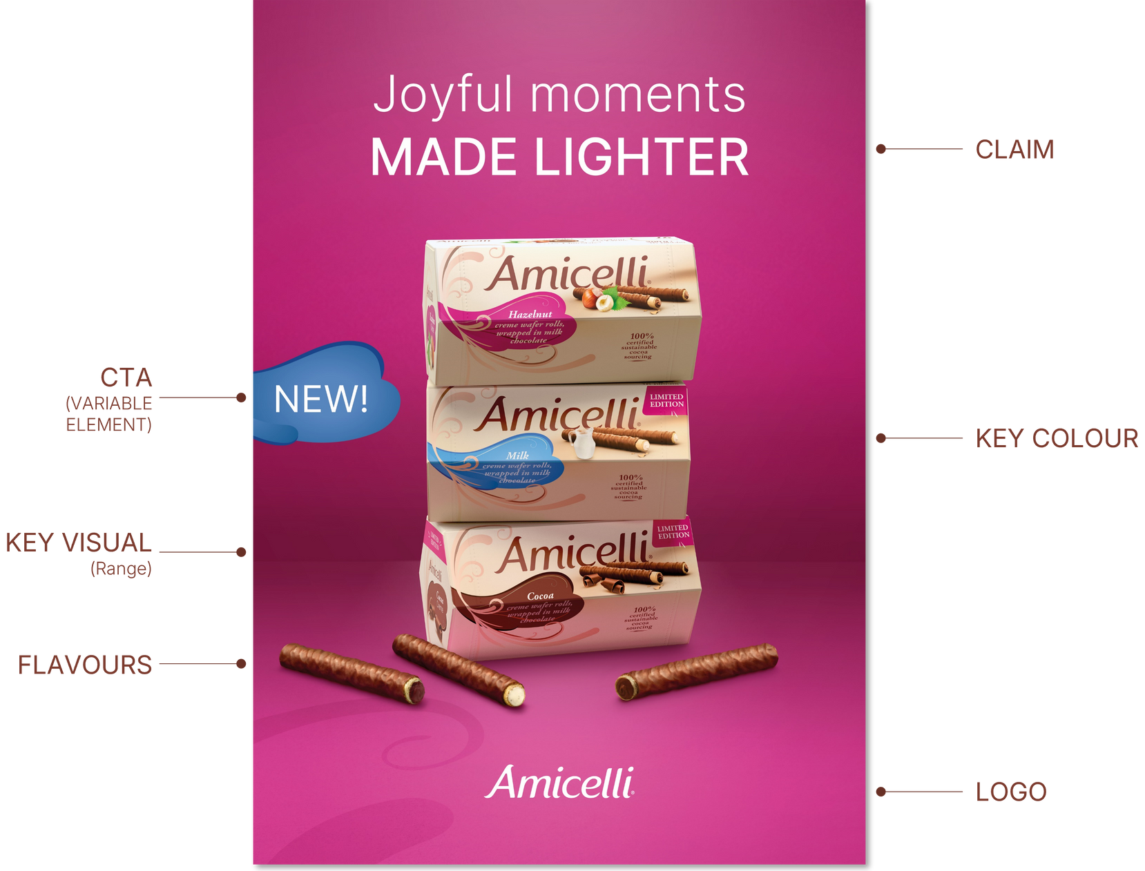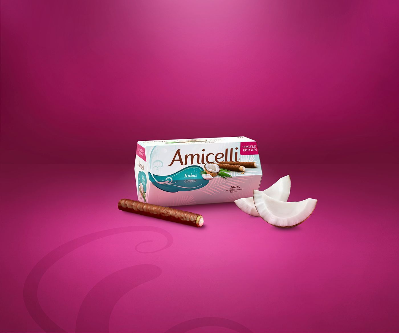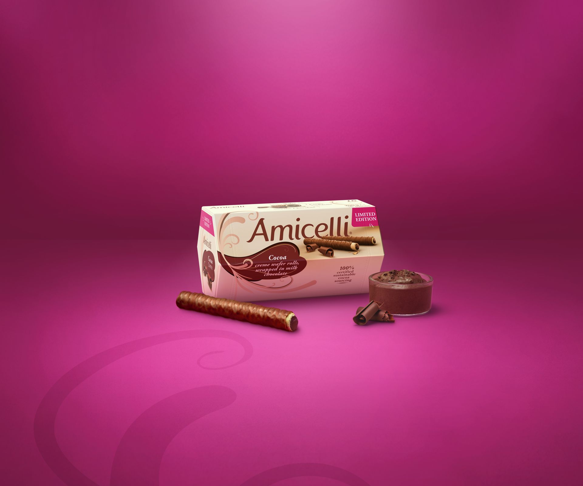 The Amicelli wafer roll is a harmonious combination of a crispy wafer (24%) filled with a tender cream (hazelnut, cocoa or milk – 45%),